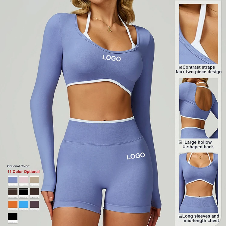 Women Double Layer Halter Adjustable Spaghetti Strap Long Sleeve Seamless Yoga Crop Top Gym Running Pilates Activewear